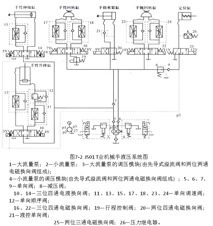 本节介绍的JS01工业机械手属于圆柱坐标式、全液压驱动机械手,具有手臂升降、伸缩、回转和手腕回转四个自由度。执行机构相应由手部、手腕、手臂伸缩机构、手臂升降机构、手臂回转机构和回转定位装置等组成,每一部分均由液压缸驱动与控制。它完成的动作循环为:插定位销→手臂前伸→手指张开→手指夹紧抓料→手臂上升→手臂缩回→手腕回转180o→拔定位销→手臂回转95 o →插定位销→手臂前伸→手臂中停(此时主机的夹头下降夹料)→手指松开(此时主机夹头夹着料上升)→手指闭合→手臂缩回→手臂下降→手腕回转复位→拔定位销→手臂回转复位→待料,泵卸载。