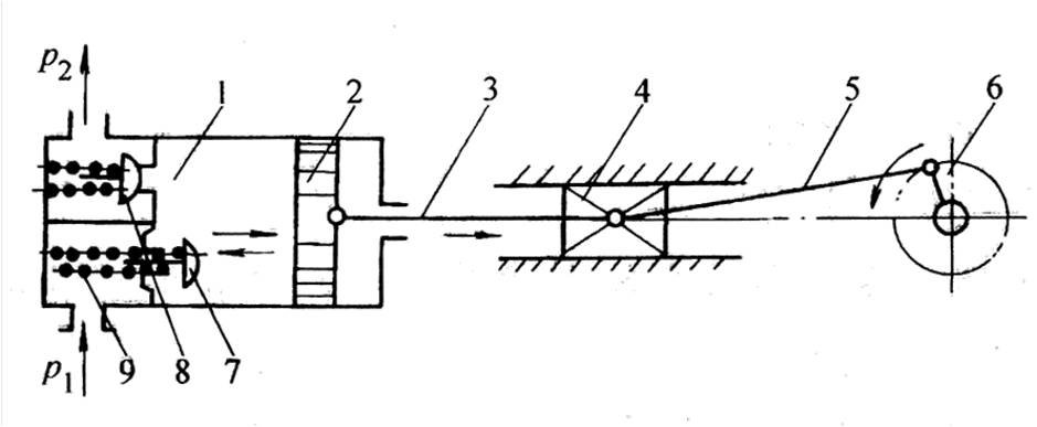 Ø吸气过程:曲柄6回转带动气缸活塞2作直线往复运动,当活塞2向右运动时,气缸腔1容积增大形成局部真空,在大气压作用下,吸气阀7打开,大气进入气缸1。Ø排气过程:当活塞向左运动时,气缸1内容积缩小,气体被压缩,压力升高,排气阀8打开,压缩空气排出。