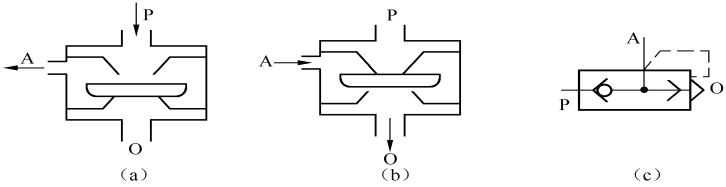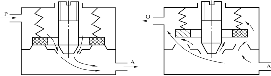 当气体从P通入时,气体的压力使密封活塞下移封闭快速排气口O,并导通P口和A口,当P口没有压缩空气时,密封活塞上移,封闭A和P通道,A通过排气通道O而快速排气(一般排到大气中)。