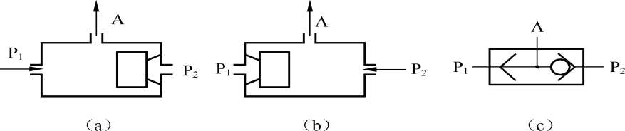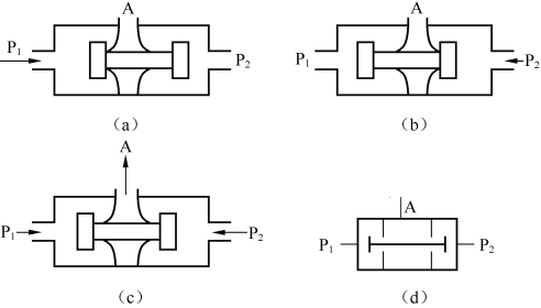 其工作特点是只有P1和P2同时供气,A口才有输出;当P1或P2单独通气时,阀芯就被推至相对端,封闭截止型阀口;当P1和P2同时通气时,哪端压力低,A口就和哪端相通,另一端关闭,其逻辑关系为“与”,图形符号如图。