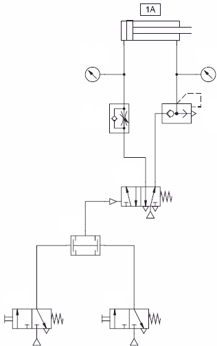 问题分析:只有同时按下两个按钮时,双压阀(与门逻辑)才工作,此时二位五通换向阀在左位工作,气缸左腔通过单向节流阀而充入压缩气体,而右腔通过快速排气阀排出气体,活塞快速运动。如果松开两个按钮中的任意一个,换向阀不再有压力。该阀通过弹簧回到初始位置,气缸同时也返回到初始位置。