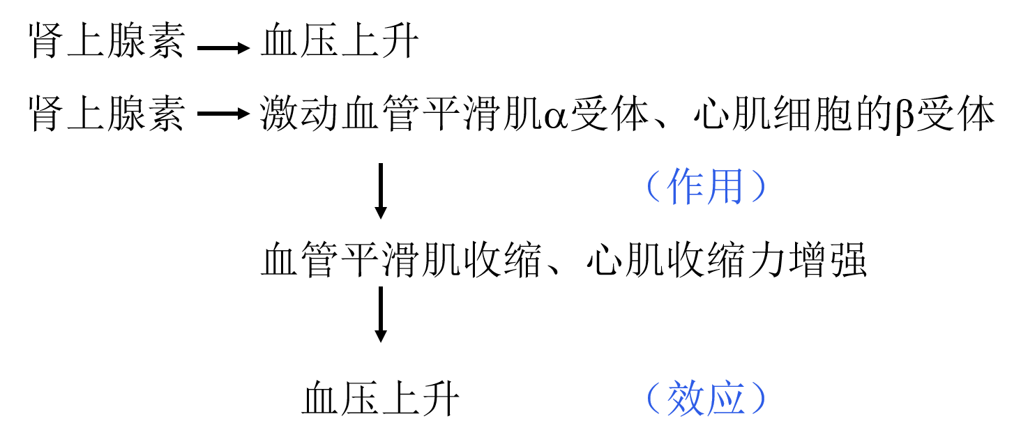 ▶ 药理效应是药物作用所引起的机体功能的继发性变化,例如肾上腺素引起的心肌收缩力增强。