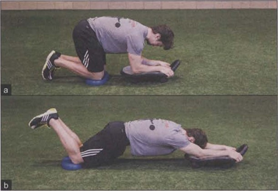 发展核心前侧能力以阻止腰椎伸展(和伴随的骨盆前倾),这可能是核心训练中最关键的部分,并且肯定应该成为核心训练的起点。骨盆前倾和下交叉综合症会让前侧核心肌肉无法控制脊椎的伸展和骨盆的前旋。在过去,人们经常推荐拉伸结合力量练习,但锻炼腹部力量以阻止腰椎伸展和伴随的骨盆前倾并没有得到认识。现在,最新的理念告诉我们,要训练这些肌肉才能阻止伸展并稳定骨盆。迈克.鲍伊尔 推荐在第1阶段教每一位运动者做平板支撑和俯卧推球,练习IA和1B以此命名。