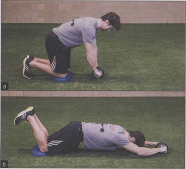 俯卧推球(图2 )实际上只是短杠杆(跪姿)平板支撑,通过滚球来加长和缩短力臂。将瑞士球想象为一个大的健腹轮。运动员的力量越弱,开始时使用的球就应该越大。瑞士球的规格以厘米为单位; 65和75厘米的球适合初学者。每个人都应从俯卧推球和平板支撑开始进行抗伸展能力的进阶练习,这非常关键。即便拥有强大腹肌的运动员也应该在前三周里每周进行两次俯卧推球。从健腹轮廾始练可能会增加拉伤腹肌或背部受伤的风险。