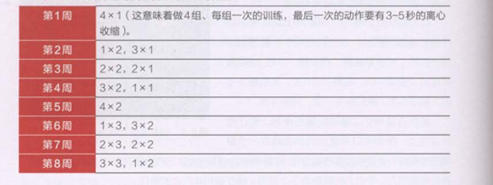 本方案有意让运动者每周只训练两次。一旦运动者能够完成无辅助的反握引体向上,就可以使用表2中的8周训练方案了。在实行这个8周进阶方案之后,运动者从1 个反握引体向上进步到5个并不稀奇。
