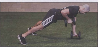 在平板划船(图3)中,运动者同样使用双臂伸直的姿势,但手中还要有一组哑铃。该动作从伸手改为划船。平板划船有许多名称和变化形式,但都应被视为抗旋转核心练习,而不是力量练习或花样表演。建议使用不会滚动的六角哑铃;干万不要使用壶铃,容易引起手腕受伤。