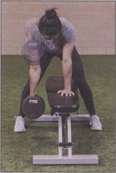 开始时采用双脚较宽的站姿,膝盖向外打开,在双脚上方。身体前倾,并将一只手放在长凳上,以稔定躯干并减少对下背部的压力。背部微引腹肌保持紧张。首先专注于移动肩胛骨,然后是肘部,将哑铃带回到髋部(图1)。这个动作非常适合初学者,但不会緞炼到髋部旋转肌群,因为它采用的是双腿站姿。做3组,每组5到10次,具体数量取决于训练所处的阶段。