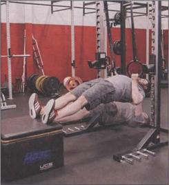练习反向划船前,将悬吊训练器材的把手调整到大约腰部的高度。关键是要弄清楚最貝挑战性的身体角度。悬吊训练器材的可调节性强,身体能够摆成任何角度。难度最大的位置是身体与地面平行,双脚放在长凳上,长凳与悬吊架之间的距离为大约四分之三的身体长度。双脚放在长凳上、双手握住把手时,躯干应该是笔直的。脚尖朝上,双脚并拢。从这个姿势直接将前胸拉向把手(图4)。大多数运动者在重复几次之后,前胸就不能碰到把手了,这是因为肩胛回缩肌和三角肌后束的力量较弱。该练习澱炼的不仅仅是上背部,还包括整个躯干。为了增加躯干肌群的功能负载能力,高水平运动者可以穿上负审背心来进行该