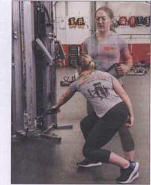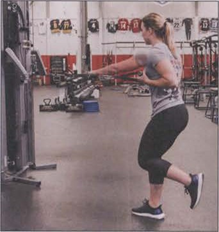 在指导这个练习时,我经常让运动者想象侧向滑步时的急停急起动作。采用肩部与拉力器或低位滑轮拉力绳平齐的姿势。手伸到身体的另一边,抓住把手,一边把手柄拉至髋部一边挺胸站立(图8,10)。