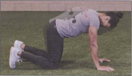 我们已经设计了一些退阶练习来帮助指导哑铃划船。哑铃划船失败的主要原因之一是无法保持背部微弓。猫伸展式(图2)是一种瑜伽练习,旨在教运动者进行脊椎的屈曲和伸展。我们将它作为一种意识训练,教会运动者在划船过程中保持背部微弓。运动者开始时四肢着地,并交替地隆起背部(像愤怒的猫),然后反转成大幅度的弓形。教运动者在髋关节不动的情况下进行脊柱运动,可以强化哑铃划船的起始姿势。做一两组,每组重复两三次,往往就足以建立起意识了。