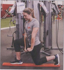 进阶1A开始时要单膝跪地,双脚呈一条直线。这意味着前脚、后膝和后脚都在一条直线上。这种窄支撑迫使运动员学习正确的技巧,同时有意使用轻负载。我们使用小橡胶平衡木来创造一个百线环境,但5厘米× 10厘米左右的木板也可以。平衡木和木板应距离器械 0.6一0.9米,以提供恰当的对角线位置。