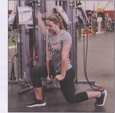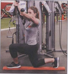 在迈克·鲍伊尔体能训练中心,下劈和上拉练习均使用三头肌训练绳,采用拇指向上的握法。我们教的下劈动作是先拉向胸部,再下压到对侧。这个动作看起来像在身体前方交叉完成一个下拉冉加上三头肌下压(图)。要将这个动作分为两个不同的部分来指导: 个拉和一个推。还要注意,在对角线模式中视线要跟着手,看着双手能够很好地控制胸椎旋转。半跪下劈有两个关键。一是将负载从高移低所必需的核心稳定性和平衡性。二是抗旋转的力量,在上拉离心部分时要抵抗被回拉向器械的力。运动员在平衡木上必须保持矢状面的稔定性,同时控制力量在额状面内移动。此外,运动员必须在额状面和水平面都保持稳定。这里的关键动作是下方腿(外侧的腿)臀肌用力,以稳定髋部与核心。抗旋转的概念是基于抵抗旋转力、保持稳定,而不是产生旋转。沙尔曼(2002年)指出:“在大多数日常活动中,腹肌的作用是提供静力支撑和限制躯干的旋转一一大部分下背部问题是由于腹部肌肉没能很好地控制骨盆和脊柱在1-5一Sl节段之间的旋转。"(71)。抗旋转可以实现沙尔曼图7.13直线单膝跪地稳定下劈所说的控制。将库克的康复理念引入体能界,使“旋转训练'成为训练词汇的一部分,这一功劳也许应该记到EXOS的创始人马克·沃斯特根名下。