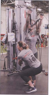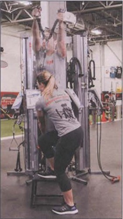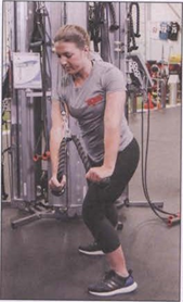 站姿上拉(图5)曾经被EXOS总裁马克·沃斯特根描述为对角推举。该动作是个爆发性交叉蹲起,结束时双臂在拉力器械的对侧伸展出去。我们不指导旋转,仅仅指导从下蹲到站立的动作。因为双脚平行的站姿加上负荷的位置,自然就会做出旋转的动作。