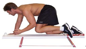 4.肩后伸,同时伸同侧髋与膝关节,运动员抬起手和腿并离地约6英寸。抬起的肘、手和膝必须与测试板的边线保持在同一平面内。躯干保持在与测试板平行的水平面内。全过程保持腰椎自然伸直姿势;