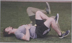 这是另一种基础练习,要求运动员把从库克提髋练习中所学到的髋部技巧运用到这个练习中。同样以仰卧姿势开始,两个脚跟蹬住地面,脚尖朝上(背屈),把髋抬起来,使膝、髋、肩呈一条直线(图3)。收縮臀部和腘绳肌来完成和保持这个姿势,而不是靠伸展腰椎。髋部下塌会大大降低练习效果。在最高点时要最用力呼气并收紧腹肌。在这个最高点的位保持5秒的呼气时间。