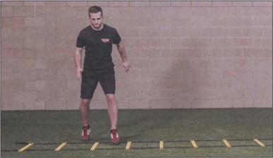 剪刀步训练(图6)是一个简单的侧向矢状面练习,运动员开始时应该有一只脚在绳梯内,并通过简单的两脚交替来完成侧向移动。如果要向右移动,运动员首先用右脚进入第一格,并按左一右一左一右的顺序沿绳梯继续移动。