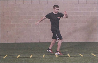 宽滑步加停顿(图5,42)被俗称为伊奇滑步,得名于辛辛那提猛虎队(Cincinnati Bengals)跑卫伊奇·伍兹(Ickey Woods)的达阵得分舞。这是一个三拍训练。绳梯训练分为节奏为1一2的两拍训练,节奏为1一2一3的三拍训练,以及四拍训练。