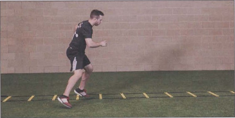 进行绳梯练习时,双脚要迅速、准确地移动,并且脚步要低。我们喜欢提示“进进出” 和“停住"。这里的关键是快速进入绳梯,然后用一只脚稳定地落在外侧。我们所有面朝前进行的绳梯练习,前进完成之后在回程时都是倒着退,运动员在练习宽滑步加停顿时也是先