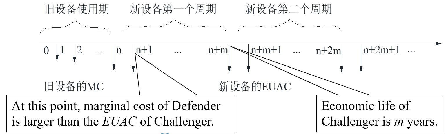 The defender should be kept n years as long as its marginal cost at EOY n is less than the minimum EUAC of best challenger.