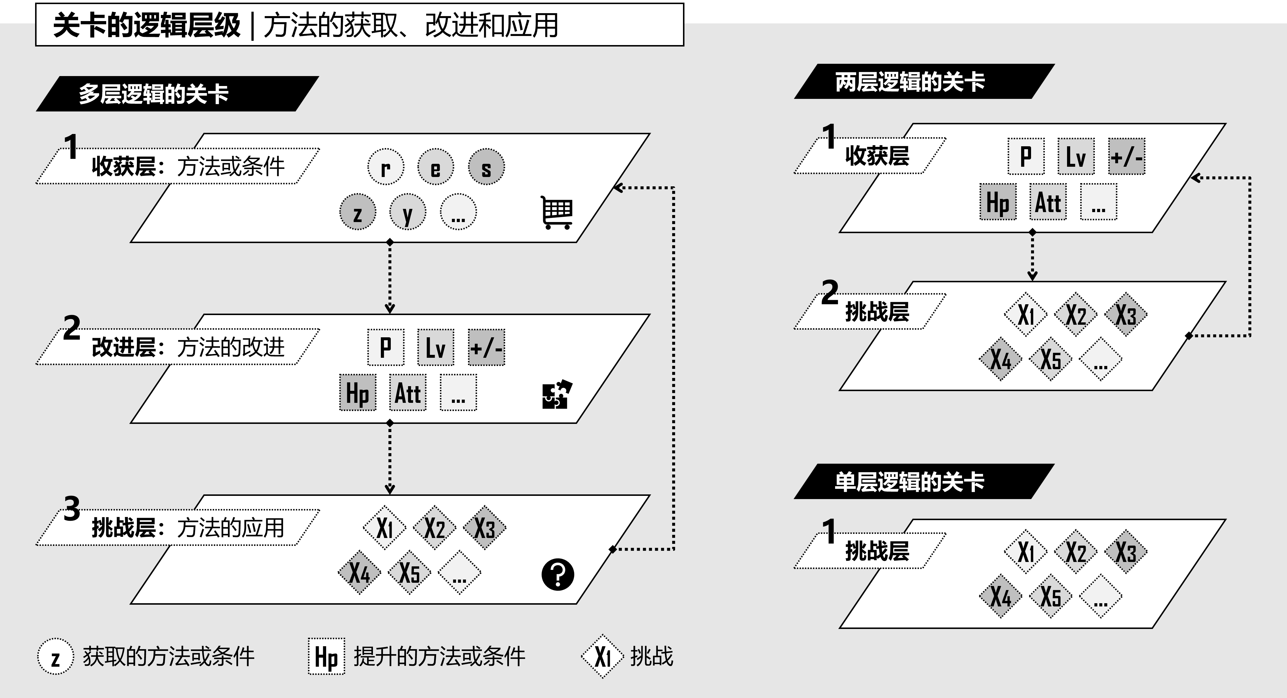 两层逻辑的关卡一般提供一个挑战层和一个收获层,挑战层提供问题,收获层提供方法,两个逻辑层级互相依赖。挑战层需要设计多个挑战环节,考验玩家利用方法解决问题的能力,而方法则来自收获层。收获层需要设计方法的收获过程,考验玩家对每个方法的价值判断能力。