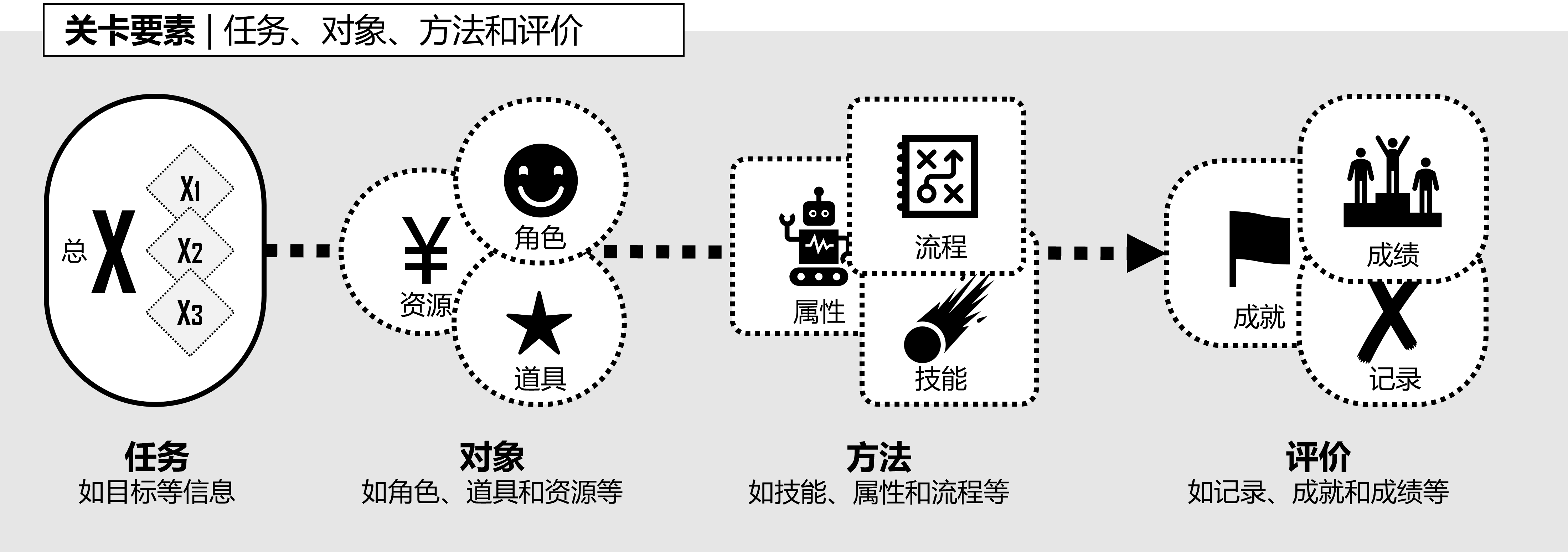 图3-4-1,构成关卡的要素,包括任务、对象、方法和评价。