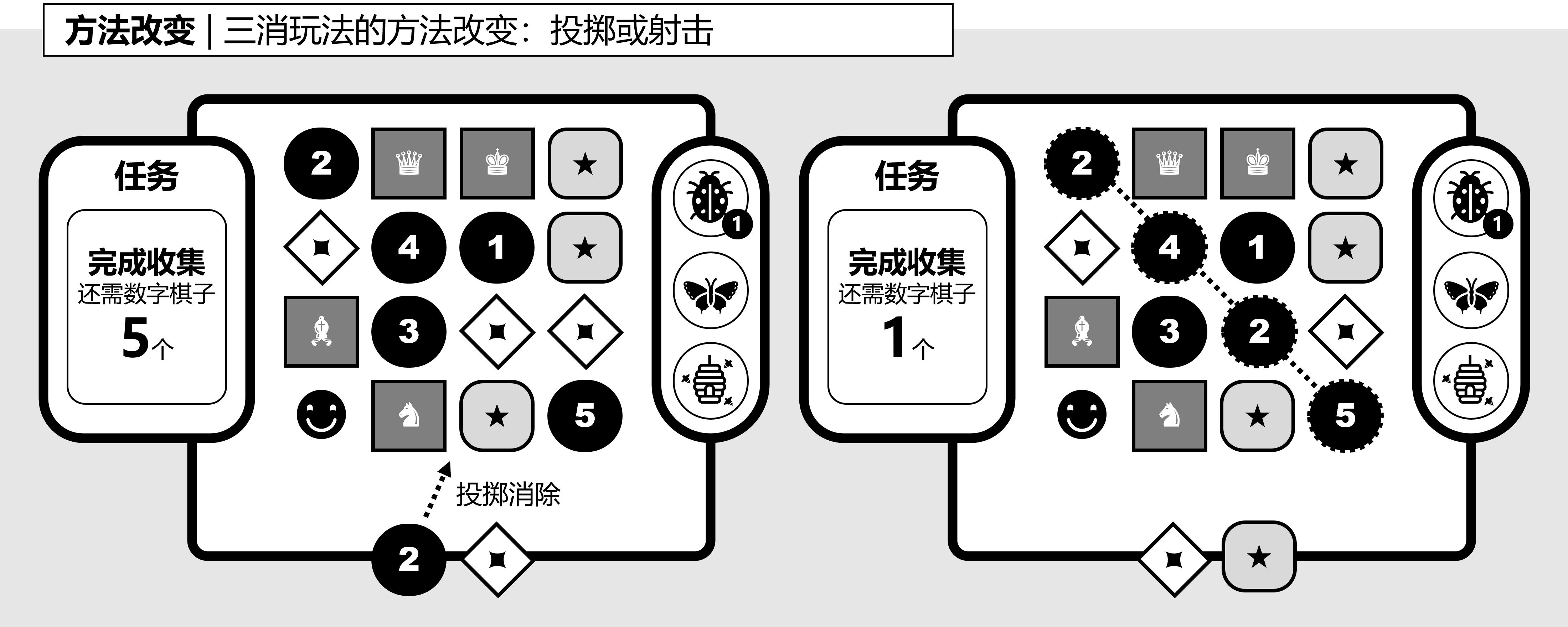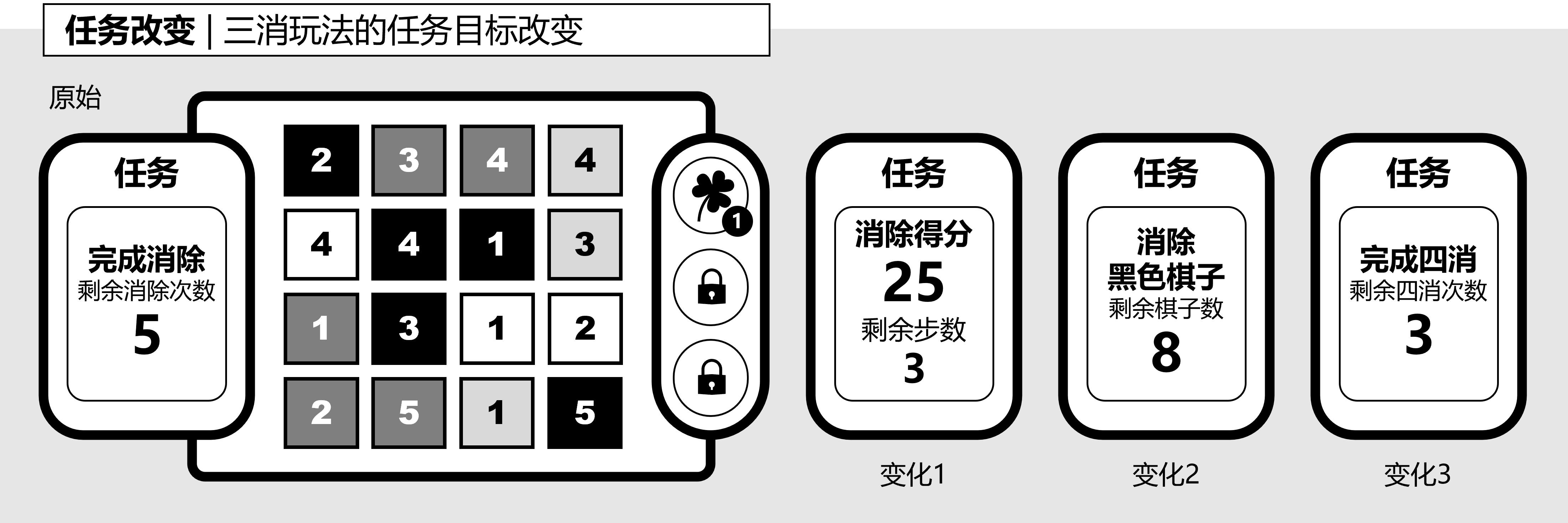 如图4-2-1所示,同样一个三消关卡,如果任务目标改变了,给玩家的挑战就不同了,那么玩家的解决思路也不一样了。