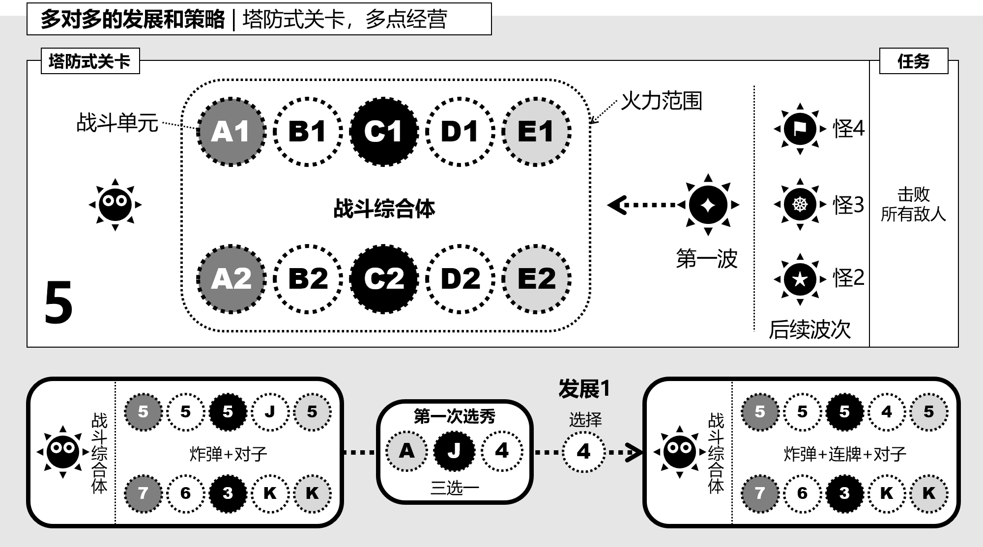 当单人塔防中的单人,被扩展成多个单元组成的战斗综合体时,就形成了一个多对多的塔防式关卡,玩家需要升级和经营的是一个复杂的战斗综合体。敌人还是一波接一波地来访,战斗综合体则负责消灭它们。图中的战斗综合体包含10个战斗单元,每个单元都可以独立战斗,最重要的是,战斗单元之间拥有关联关系,可以通过搭配组合,产生强大的战斗力。图中借用了扑克牌规则,利用对子、三张和四张扮演不同的战斗作用,就可以创造一种复杂的对抗综合体。