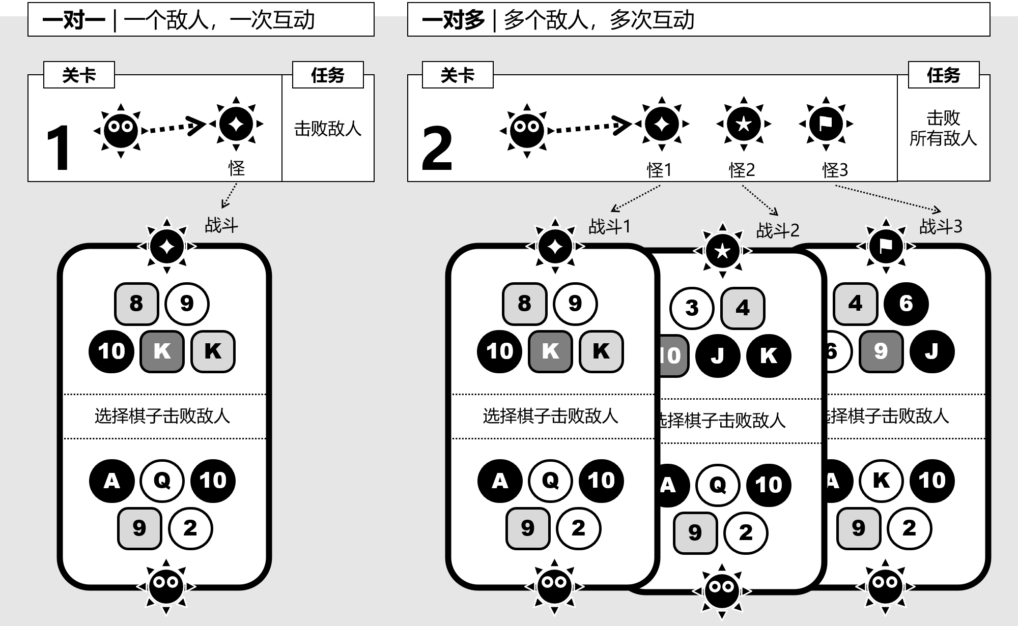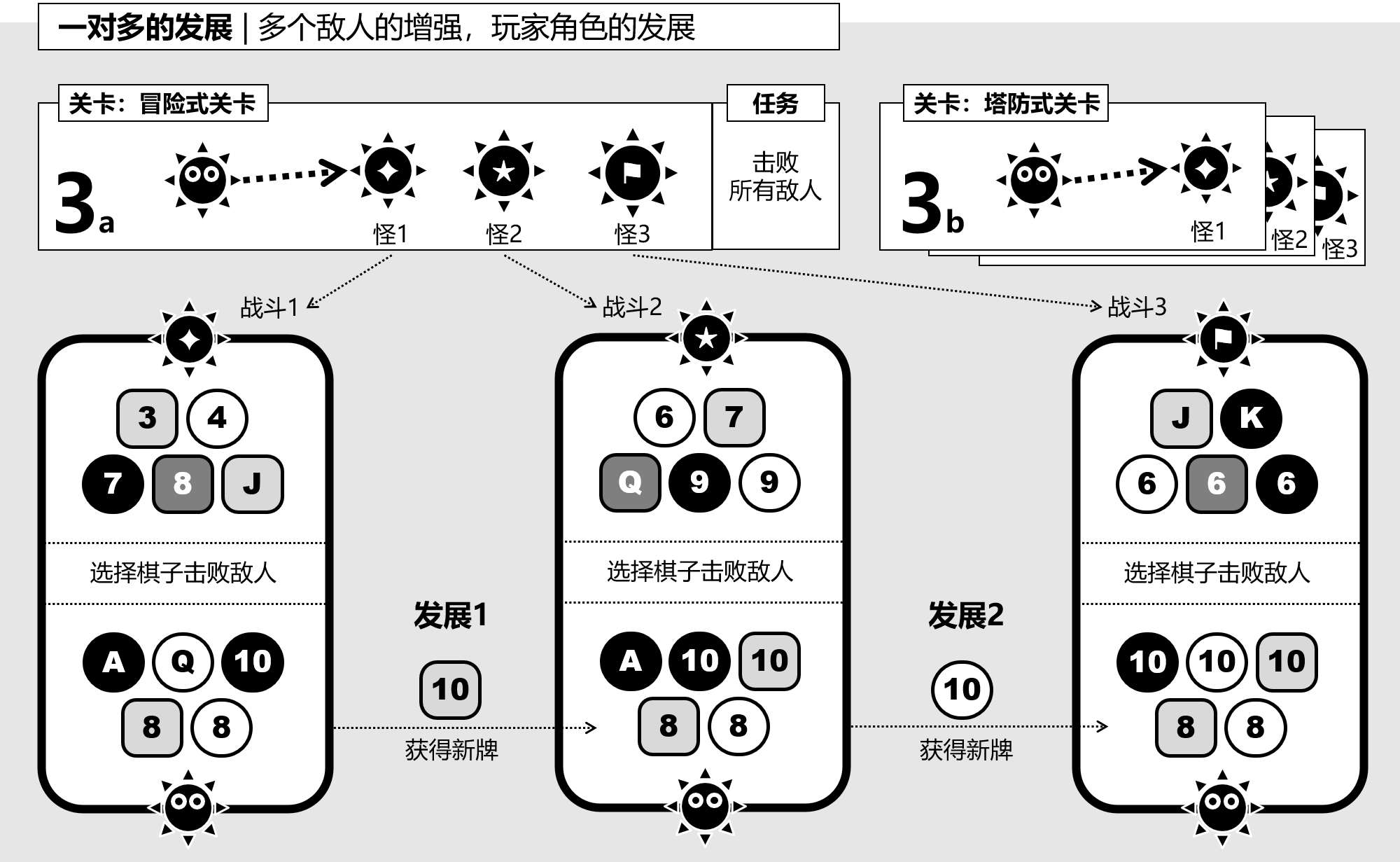简单的一对多虽然有了发展进度,但是关卡中的每个挑战目标是同等难度的,玩家拥有的条件在关卡过程中是几乎不变的。这种关卡本质上是重复的挑战,缺乏足够的发展和策略变化。