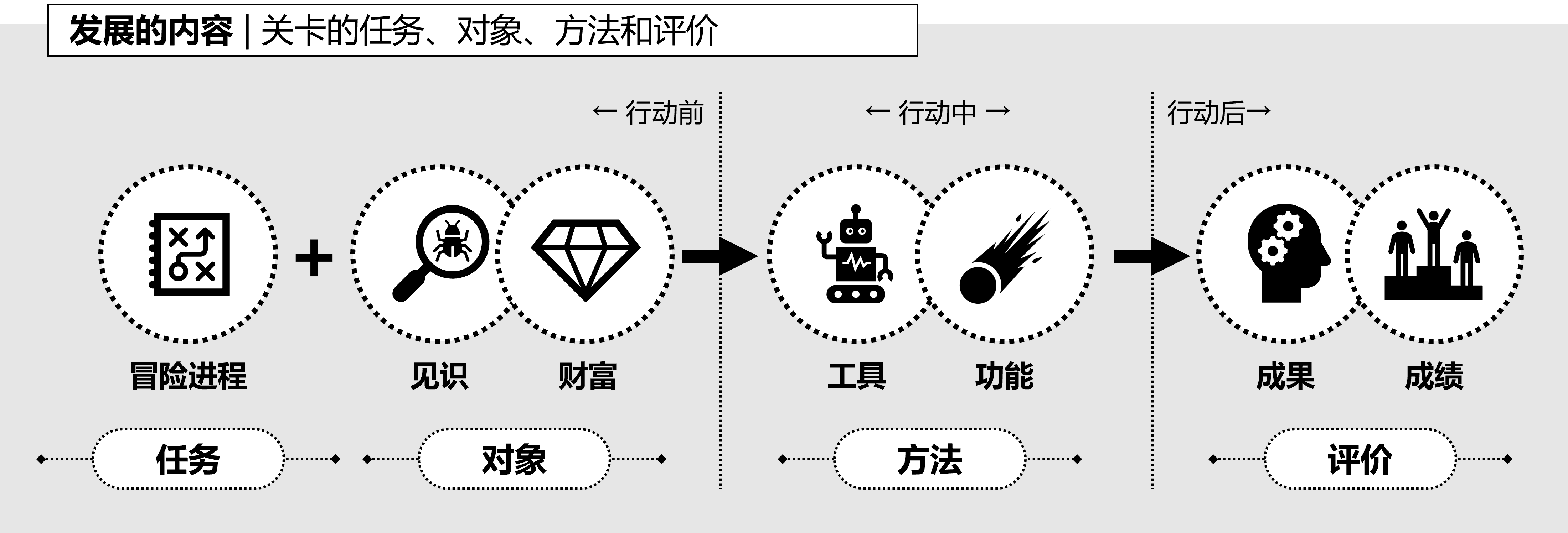 要帮助玩家发展,就要模拟发展进步过程。发展设计就是要从关卡的任务、对象、方法和评价这些环节中,寻找有发展进步意义的内容,并按照三种方式去设计发展过程。