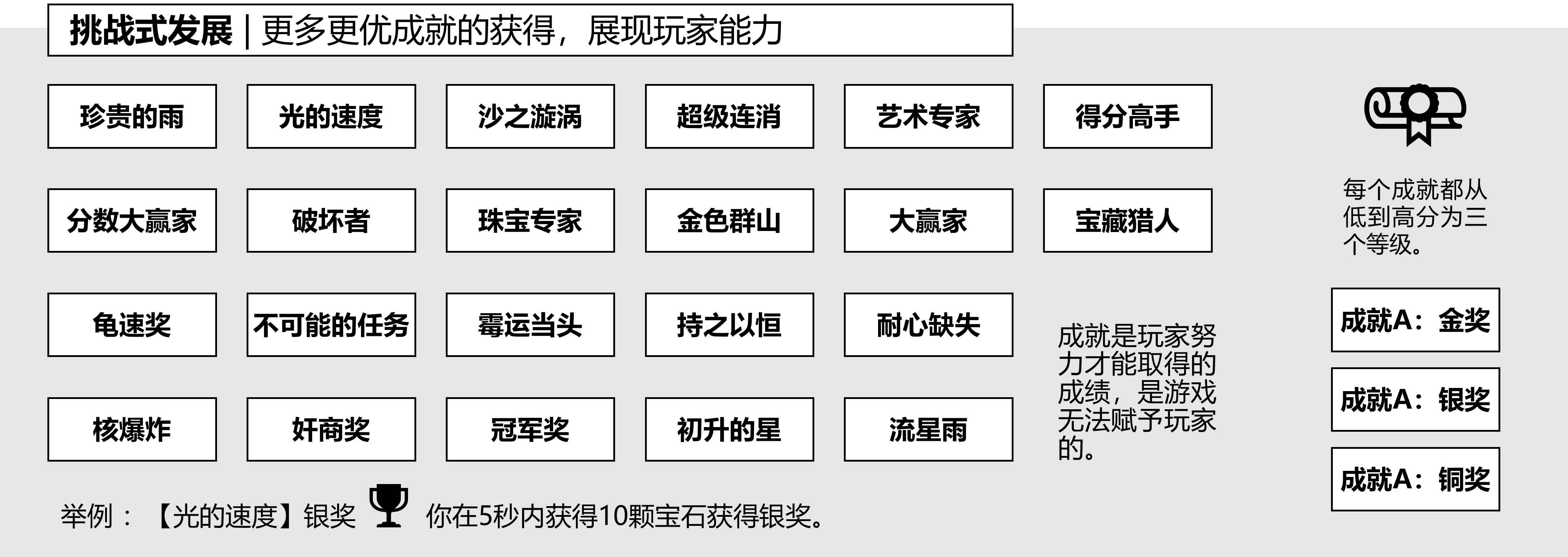 挑战式发展是围绕评价的发展,通过玩家在每个关卡所取得的成果或成绩,来反映玩家能力的进步过程。在《蒙特祖玛的宝藏3》中,每个关卡都会记录得分,而且还设置了一些特殊的成就,需要玩家不断练习和努力才能获得,如图5-1-5所示。玩家的能力包括两种,创新能力和竞技能力,前者是好奇的结果,后者是趋利的结果,这两类能力的发展特征如下: