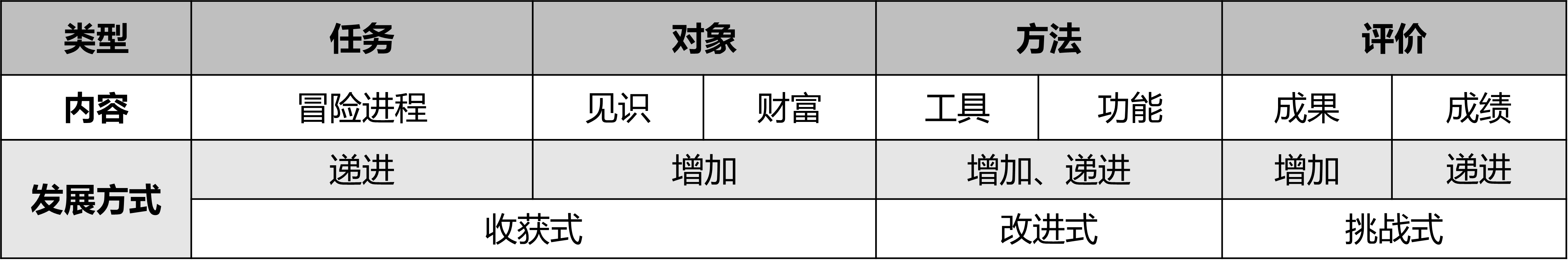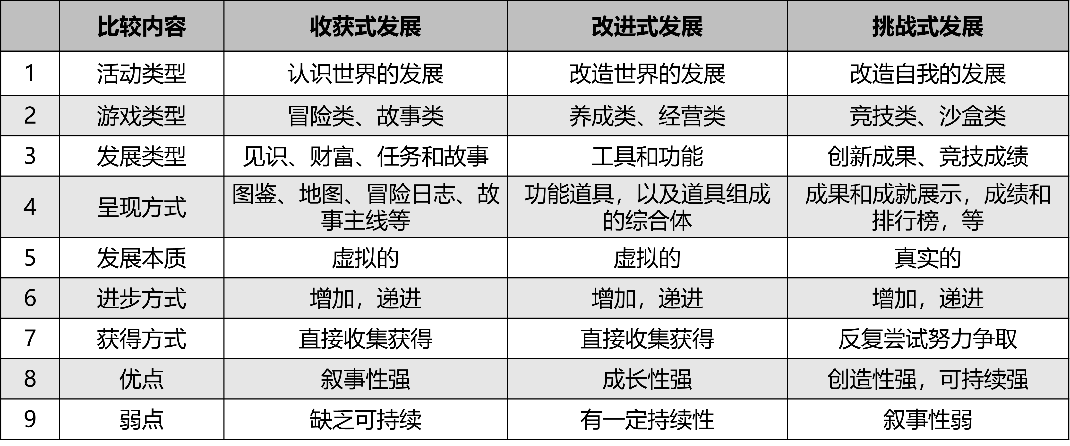 收获式发展、改进式发展和挑战式发展是三种不同的发展设计方法,分别对应认识世界、改造工具和改造自我的三种发展过程。三种发展方式也意味着三种不同的游戏类型,注重收获式发展的冒险类游戏,注重改进式发展的经营养成类游戏,注重挑战式发展的竞技比赛类、沙盒创造类游戏。