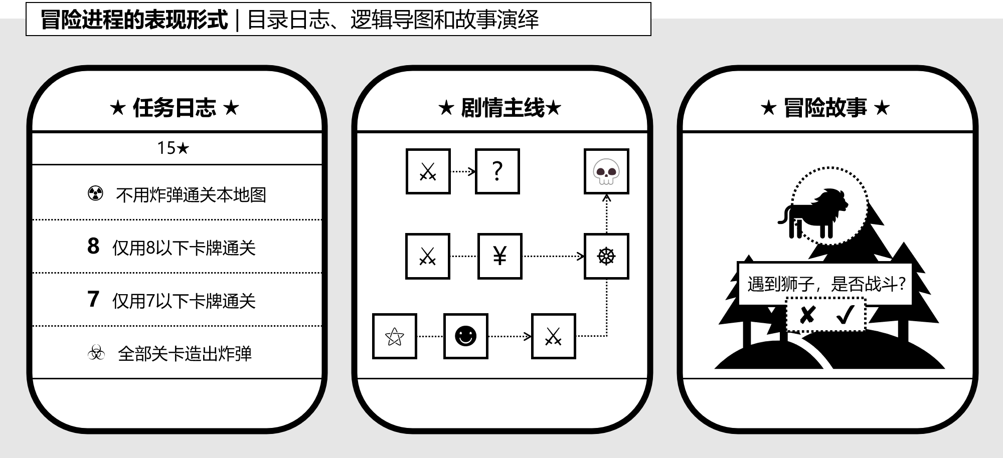 图6-1-1,冒险进程的表现形式:目录日志、逻辑导图和故事演绎。
