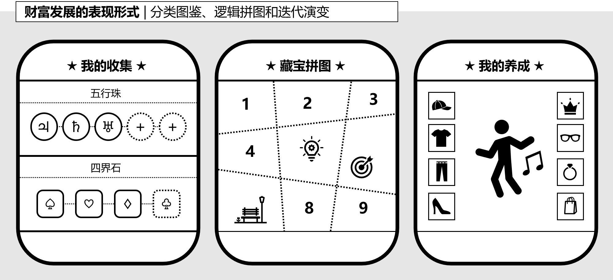 财富的发展是玩家冒险过程中收获的事物,需要按照一定的方式组织和呈现出来。财富是行动的成果,玩家通过收集归属的每个事物都是财富,将其一个个收集起来就构成了发展。