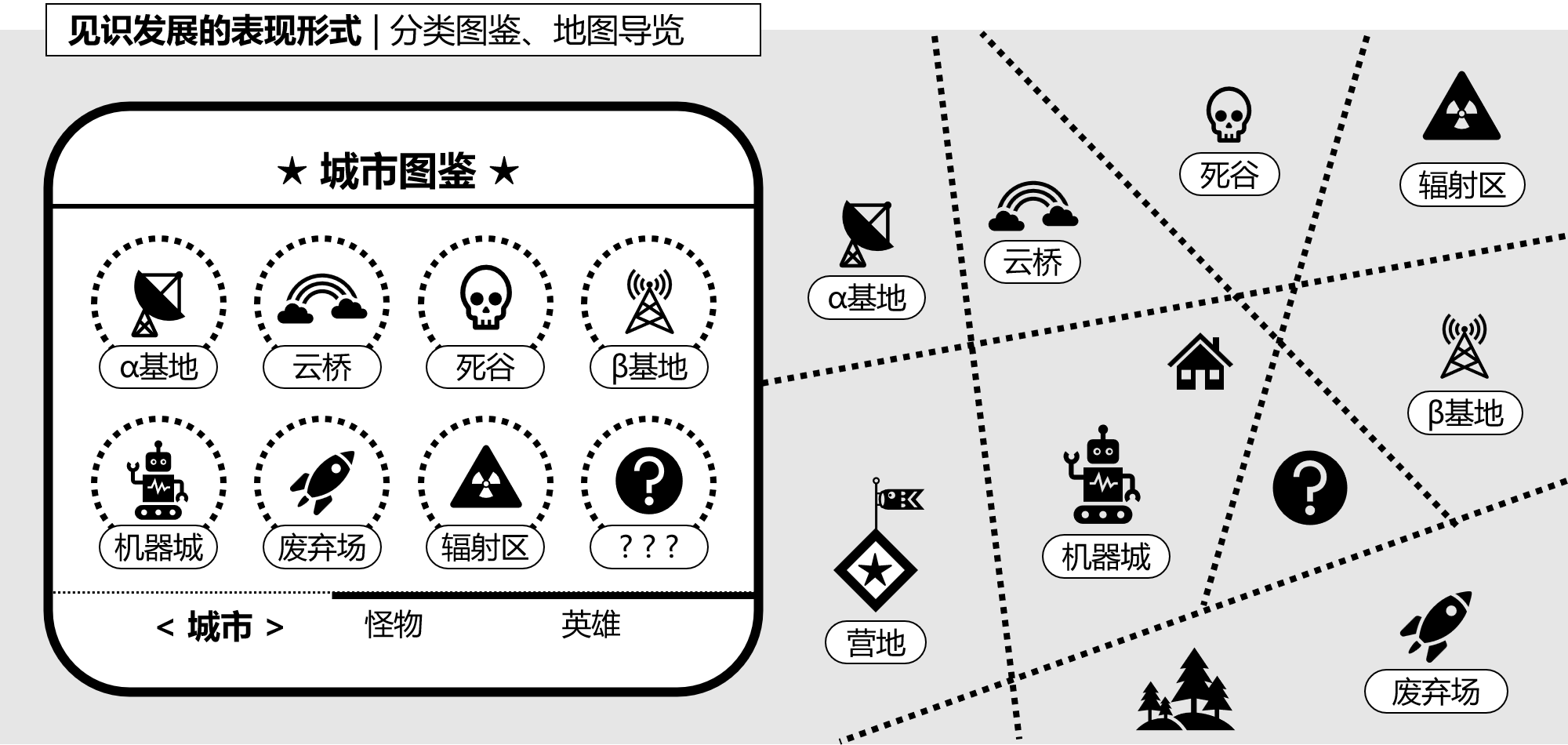图6-1-2,见识发展的表现形式:分类图鉴、地图导览。