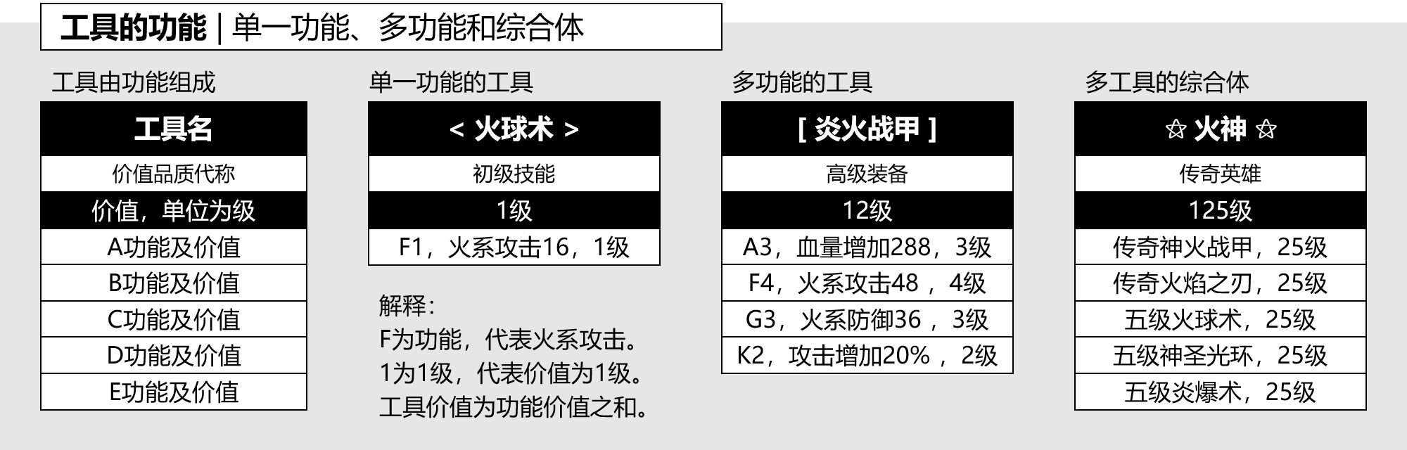 图7-1-1示范了三种工具原型,分别是火球术、炎火战甲和火神。火球术是单一功能的技能,炎火战甲是多功能的装备,而火神是多种工具综合在一起的英雄,火神的工具池里包括一个装备、一把武器和三个技能。