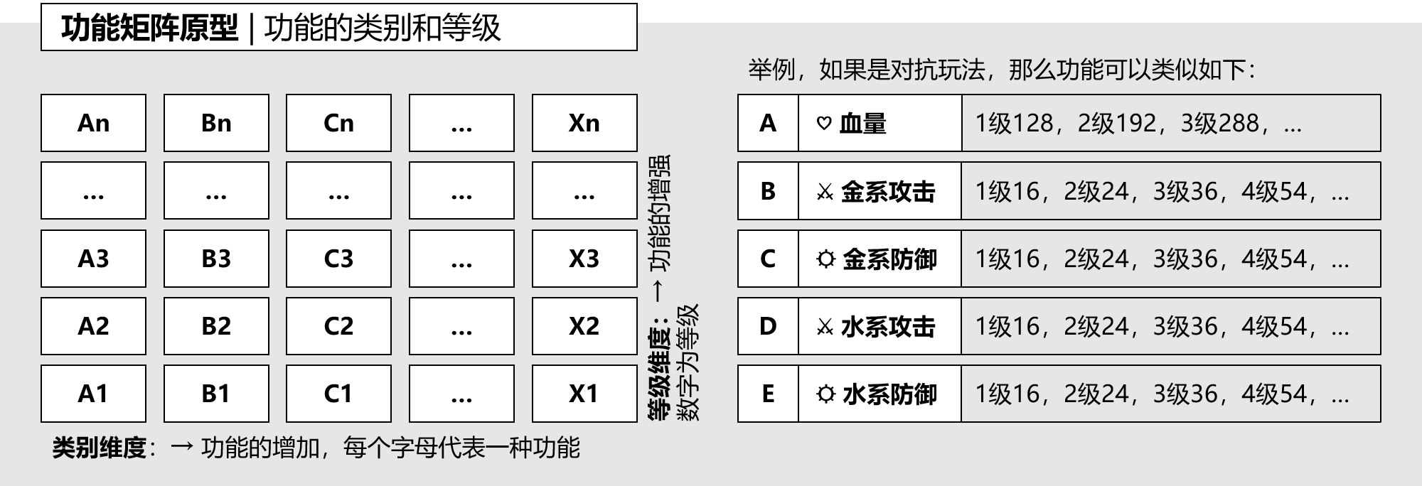 功能矩阵是将所有功能按照类别和等级两个维度,排列而成的功能列表,如图7-1-2所示。第一维度是类别维度,按照功能的类别进行排列,每一组都是不同的功能,互相是并列关系。第二维度一般是等级维度,按照功能的强弱进行排列,每一组是同一功能的不同等级,互相是强弱递进关系。功能矩阵还可以增加第三维度即策略维度。