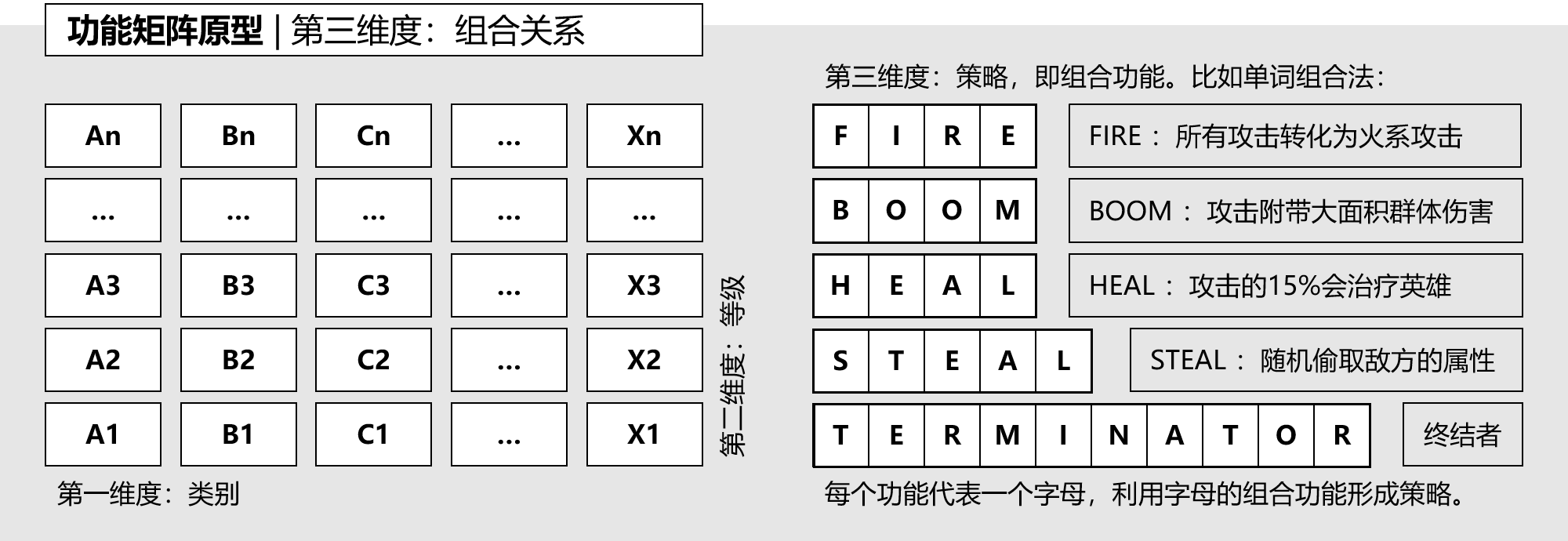 如图7-1-3所示,这是有第三维度的功能矩阵,通过功能类别的组合来增加策略。图中巧妙设计了单词组合法,按照单词来定义功能。每个功能为一个字母,当工具中的功能组合出一个单词时,就激活了该单词的组合功能。