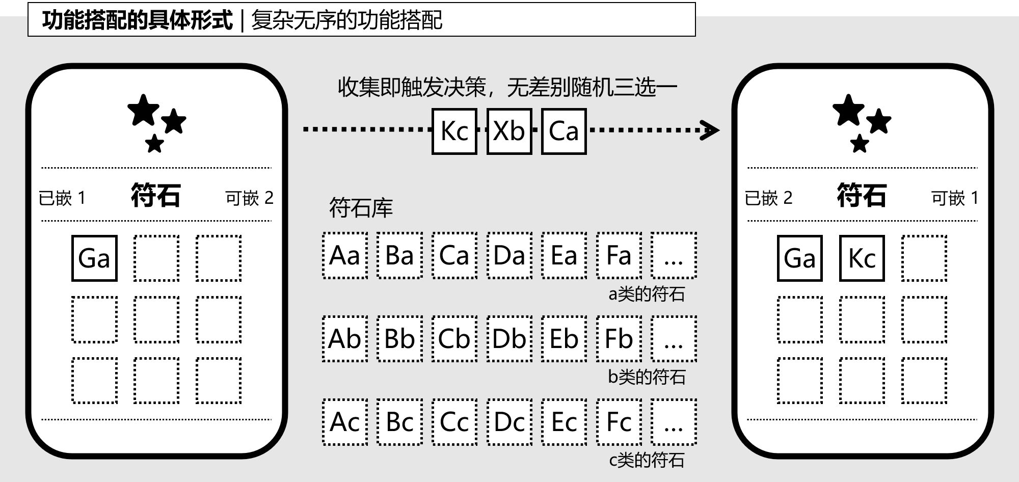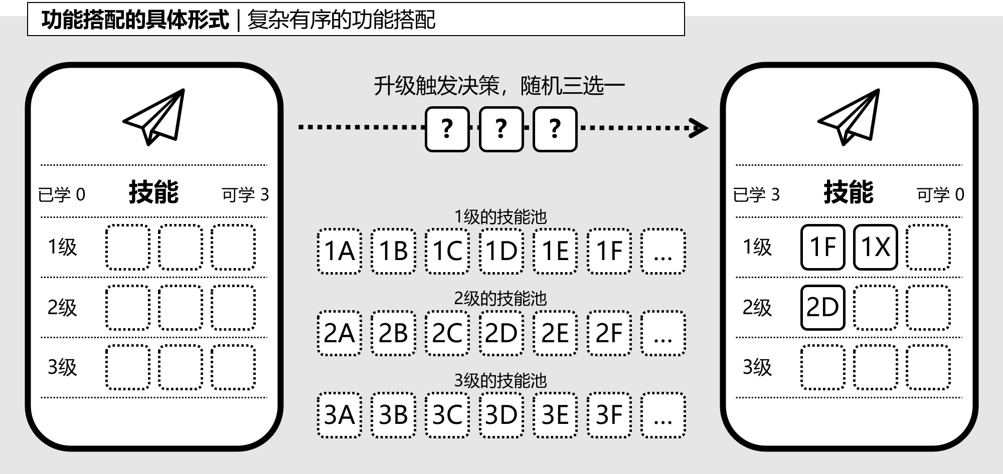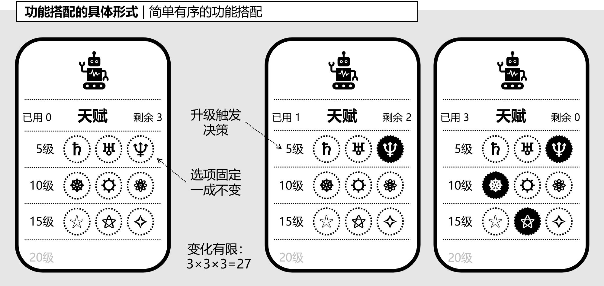 这种方式的功能矩阵比较简单,功能较少,每一次决策的功能选项都是明确的。它的优点是很直观,玩家甚至可以早早规划好升级路线。缺点当然也很明显,就是变化不多,缺乏创新的可能。