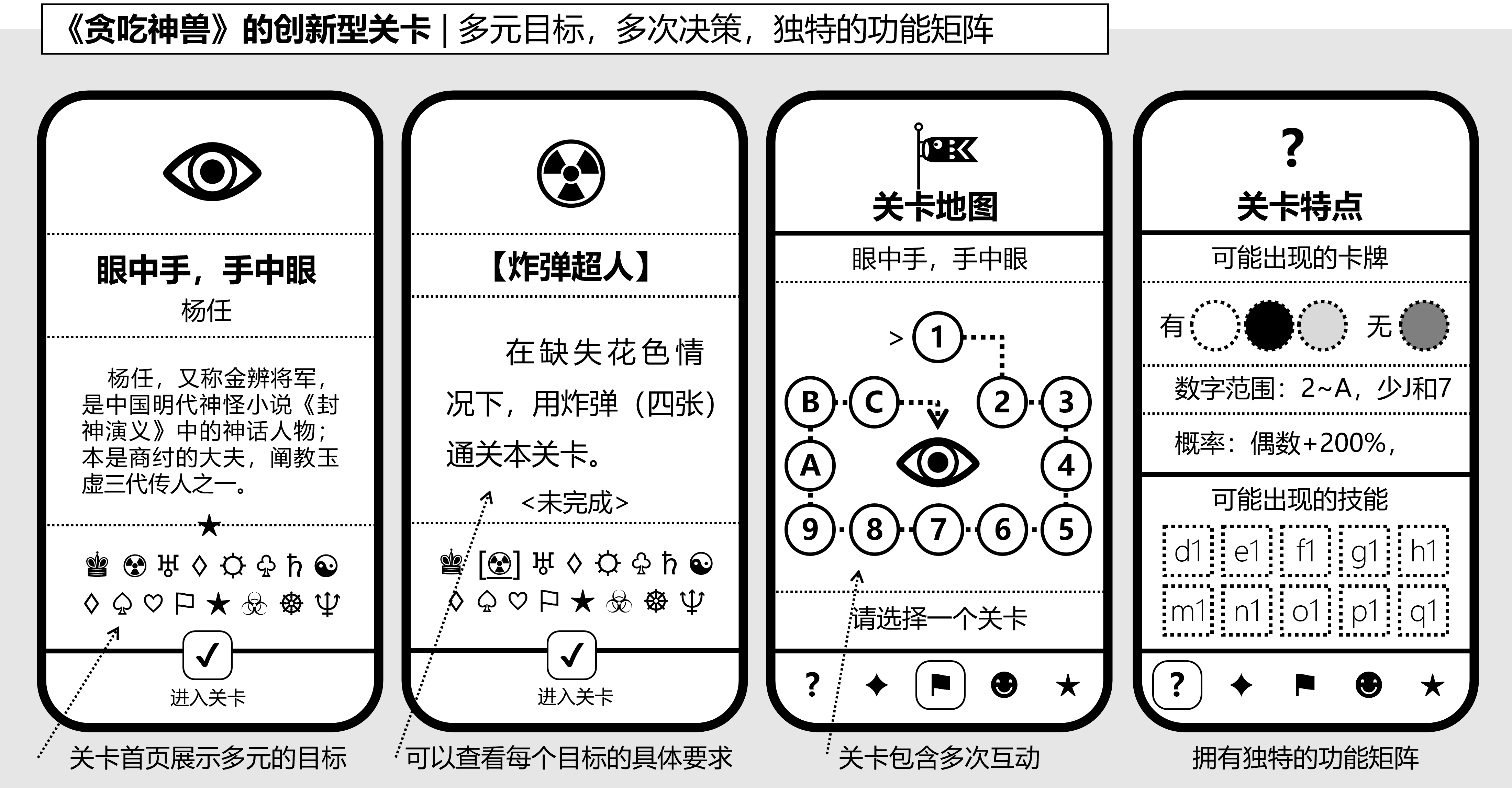根据《贪吃神兽》的设计逻辑,我们选择眼中手手中眼(杨任)作为标准关卡,并按照多元目标、多次互动、多项选择的设计要求,完成了关卡的设计,关卡原型图如图8-2-6、图8-2-7所示。