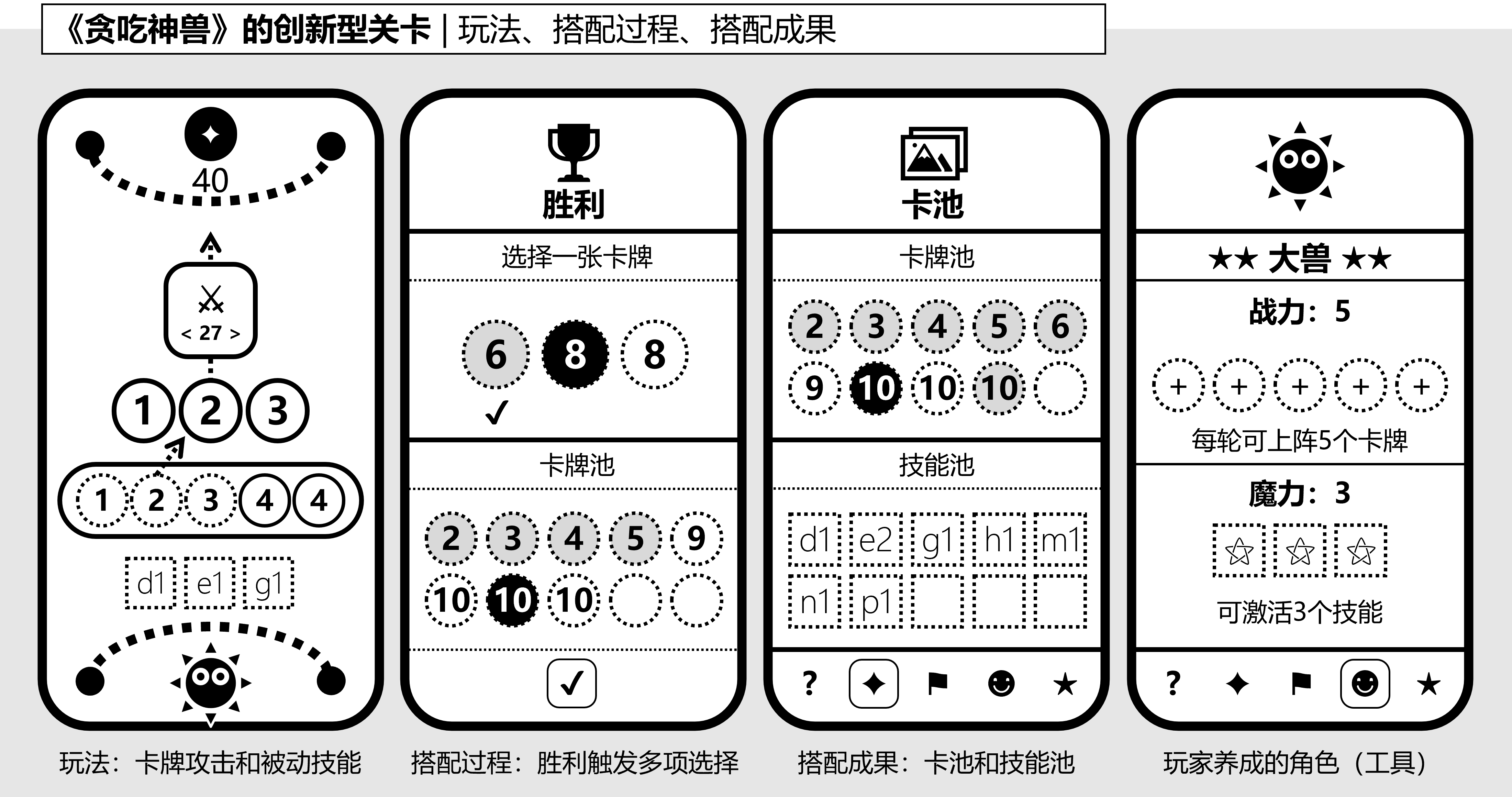 我们这里继续利用《贪吃神兽》这个游戏概念来示范创新式关卡的设计,该游戏概念模仿了《杀戮尖塔》的卡牌玩法,以扑克牌为功能矩阵,卡牌池和技能池的配置养成过程就是玩家的创新过程。
