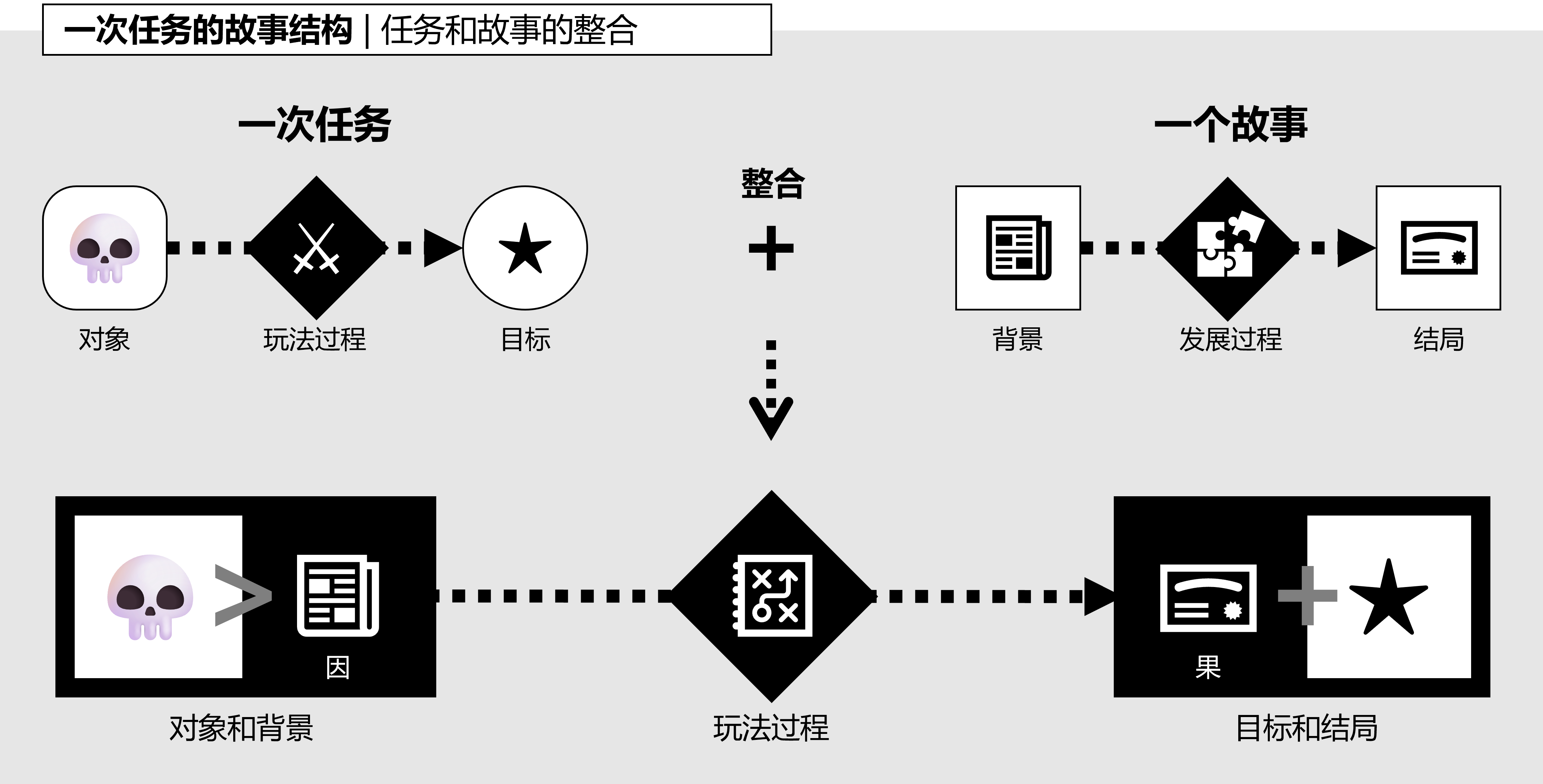 将故事赋予游戏,就要将故事与任务结合起来,按照任务的结构来编写故事。任务是游戏中最基本的行动,任务结构包括对象、玩法过程和目标。故事结构包括背景(因)、故事发展和结局(果)。将两者结合后,就形成了一次任务的基本结构:对象引出故事的背景,玩法过程代表故事的发展,完成目标则实现故事的结局,如图9-3-1所示。