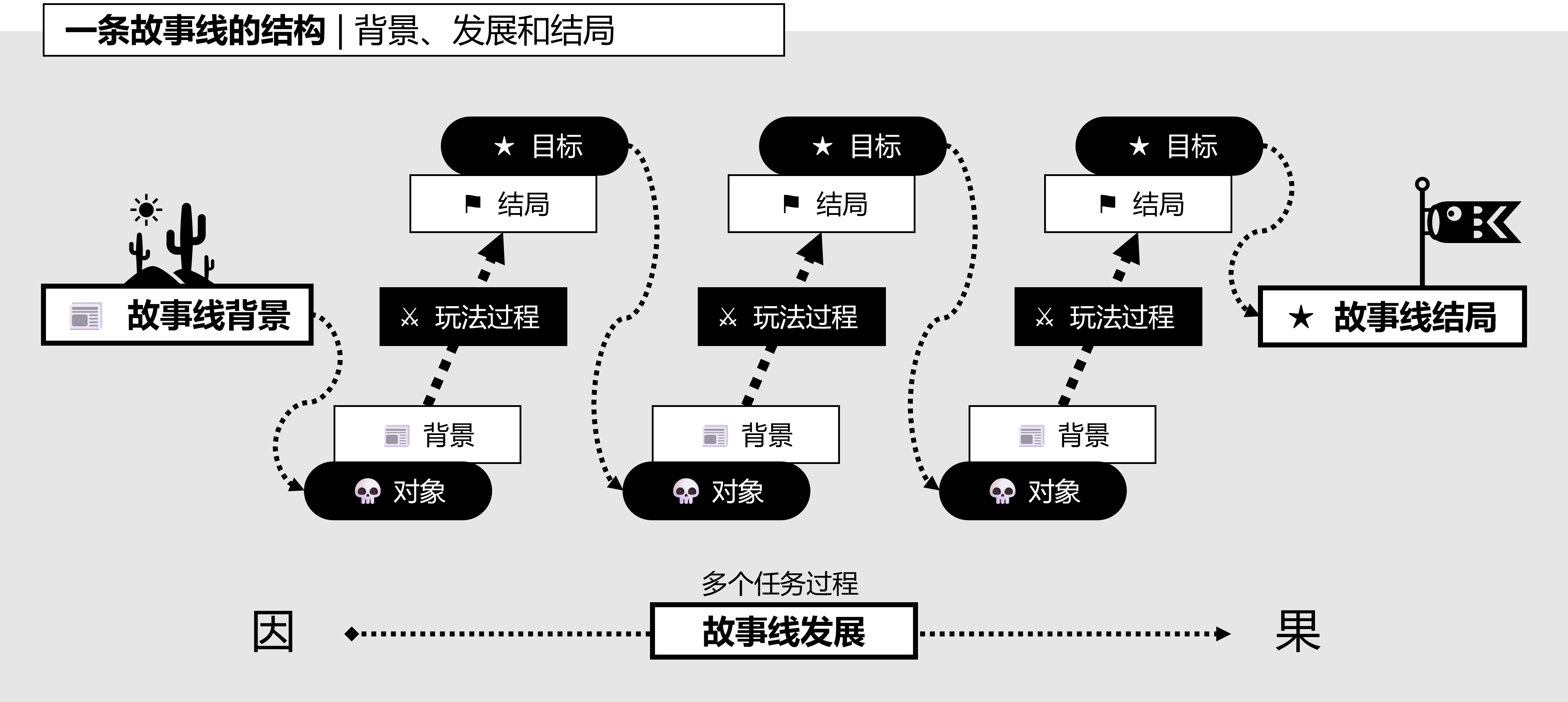 2、故事线发展:故事线发展是剧情故事的发展,一般由多个任务过程组成。每个任务过程都包括对象和故事背景、玩法过程、目标和故事结局。每对故事背景和结局构成了一组因果,实现一个任务过程。多个任务根据因果关系,形成故事线。