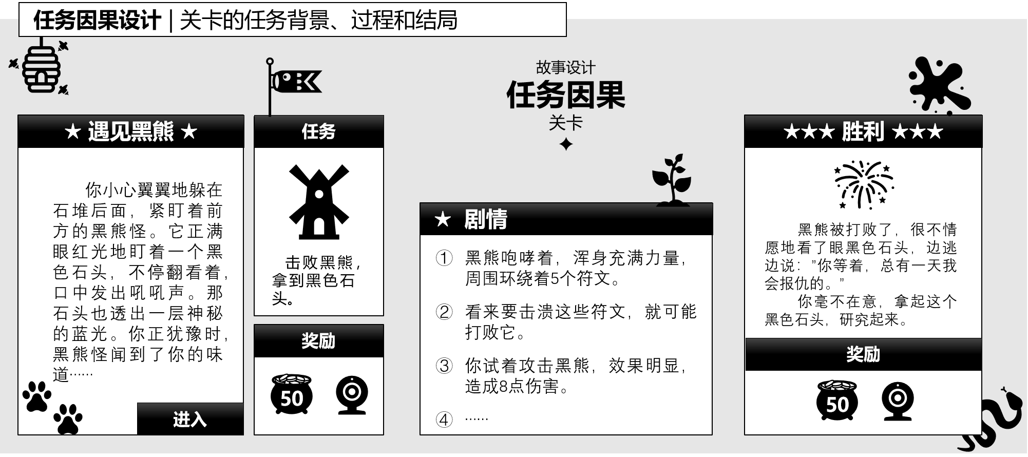 游戏最终是由一个个具体任务构成,任务因果是激发共情、价值观认同的具体故事内容。任务的因果设计就是要讲述具体的故事,将故事背景作为任务的因,将故事结局作为任务的果,完成故事与任务的契合,用一个个具体的故事来践行游戏所需传达的价值观或主题思想。