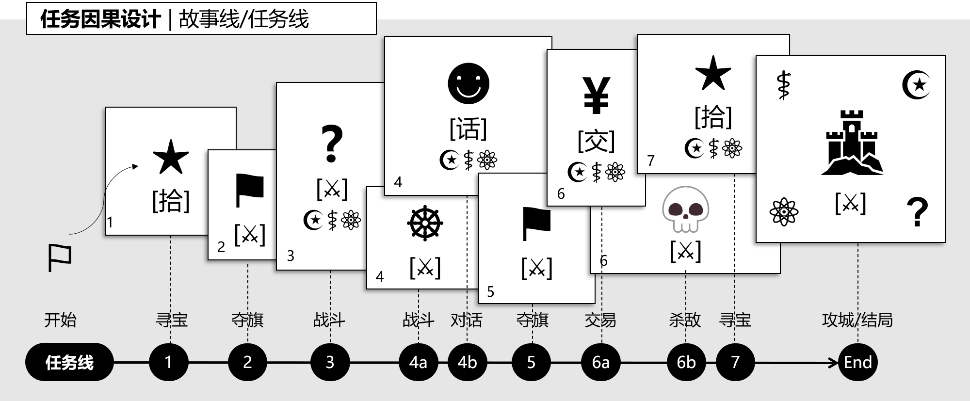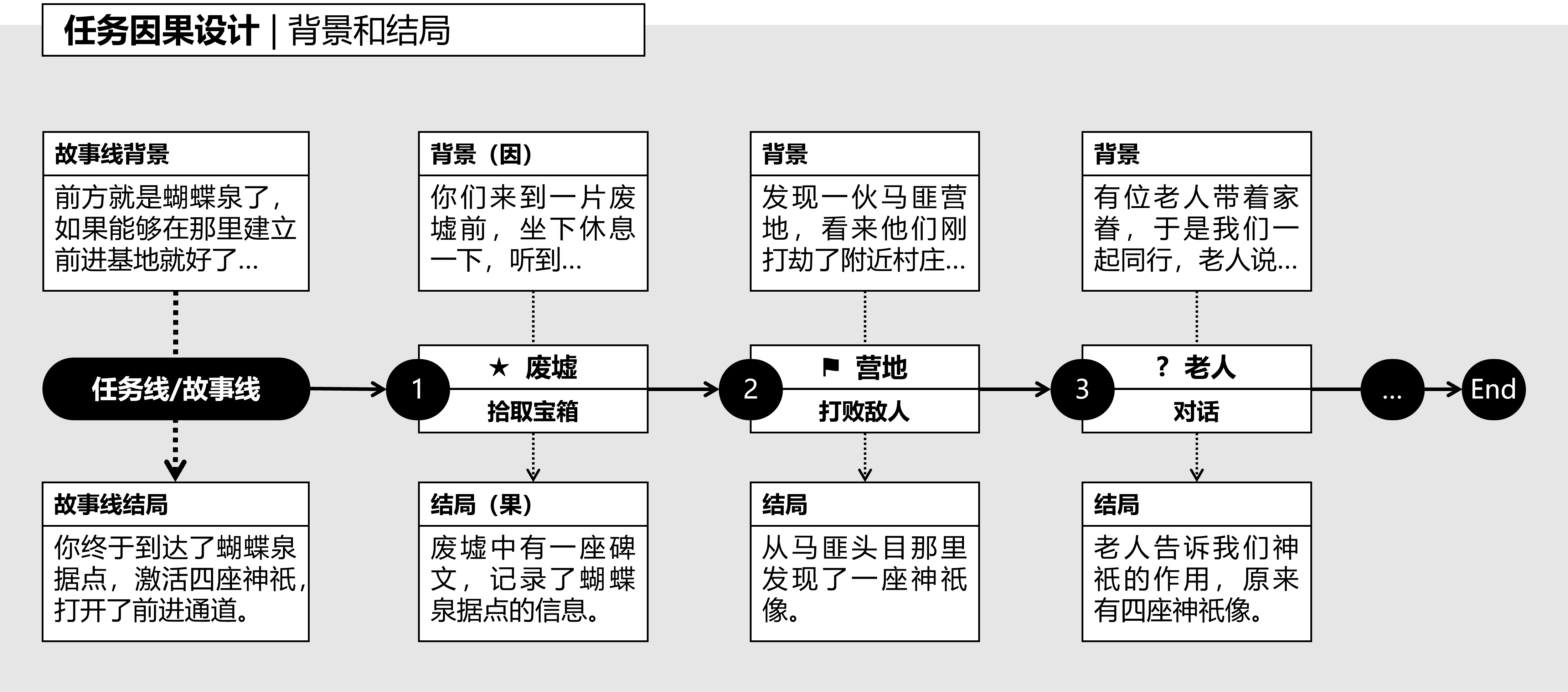 任务因果是故事发展中的一个局部,需要完整考虑整个关卡流程和故事因果的发展,因此,需要先明确任务线,然后再设计每个节点的因果。