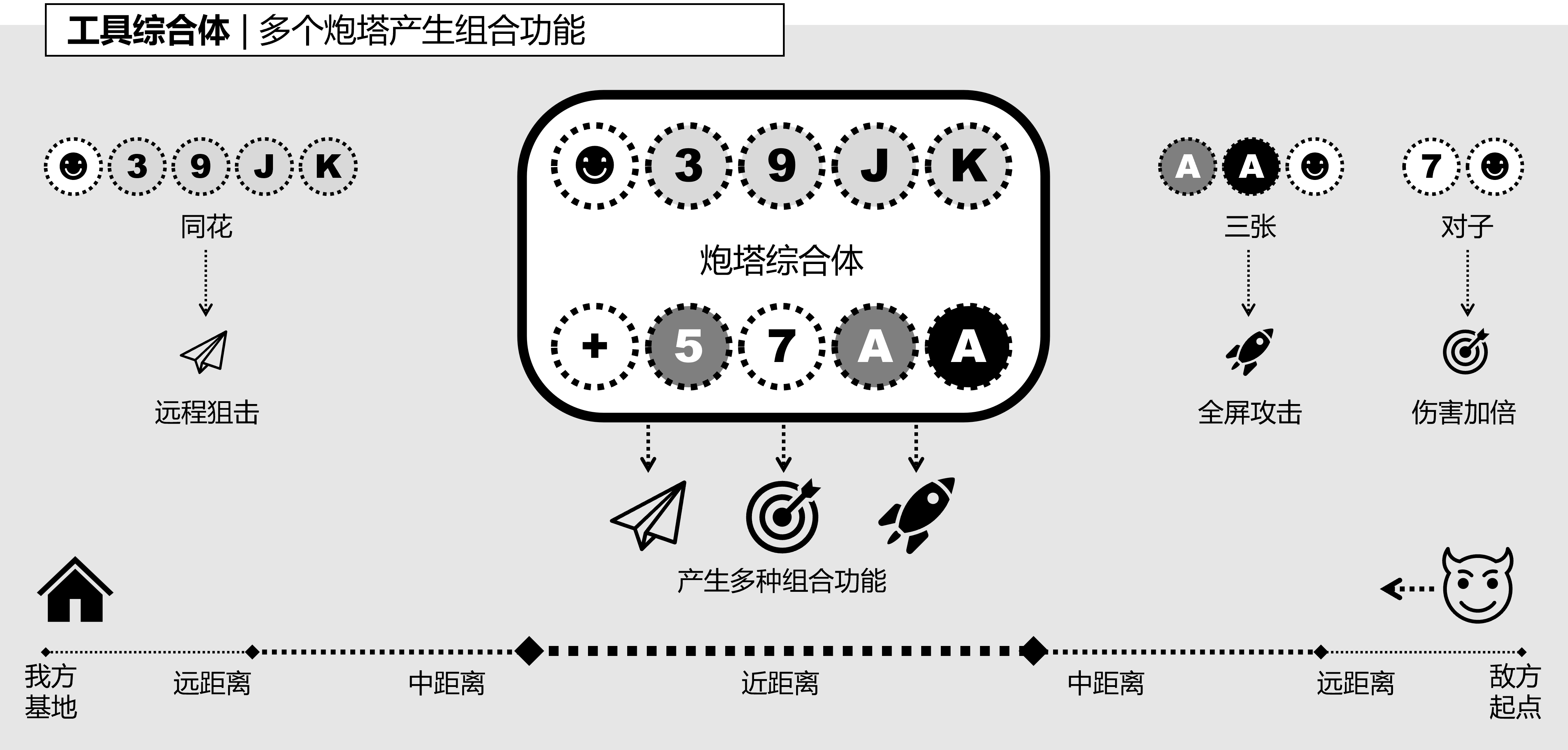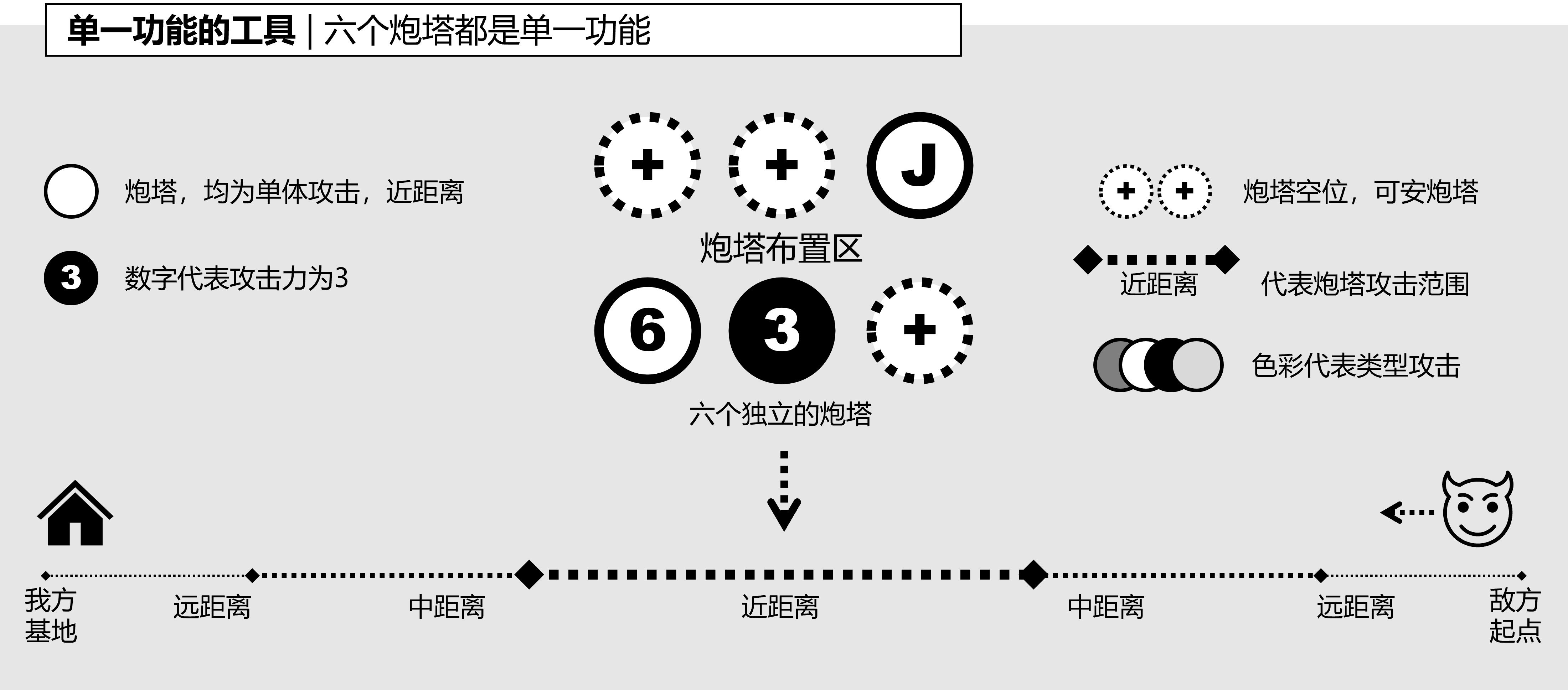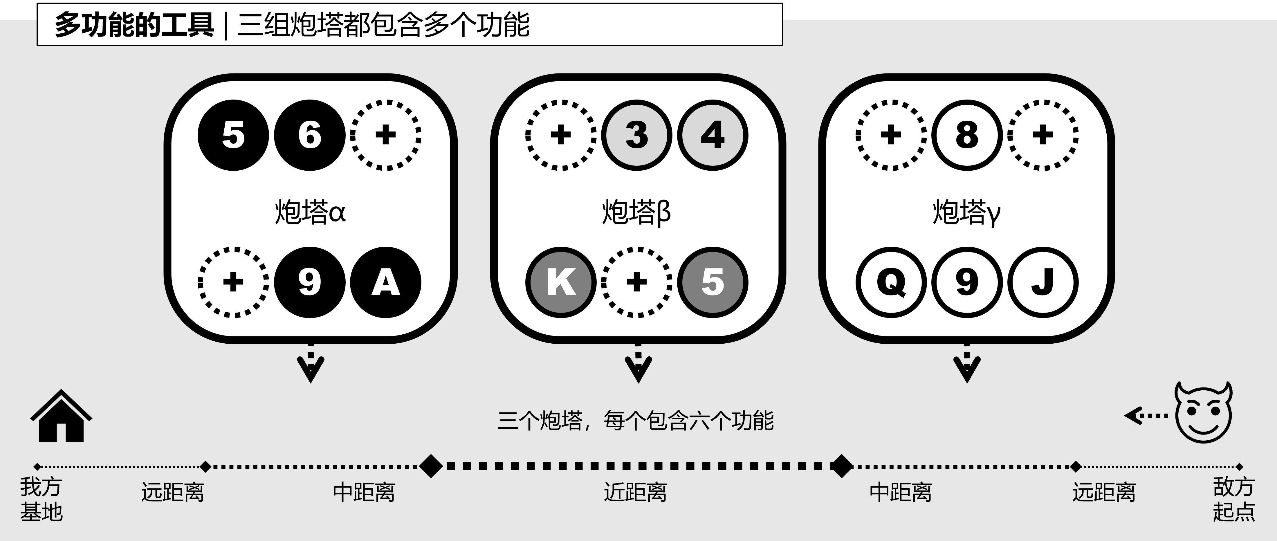 工具是功能的集合,根据复杂程度可以分为:单一功能、多功能和综合体。以塔防游戏为例,《保卫萝卜》的炮塔大多是单一功能的,《王国保卫战》的炮塔基本上是多功能的,《明日方舟》的干员是多种装备综合的。游戏好不好玩并不取决于复杂程度,而在于决策的设计。以下将围绕塔防游戏来示范工具的设计,采用了扑克牌的矩阵来设计炮塔的功能,分别完成了三种复杂程度的炮塔。