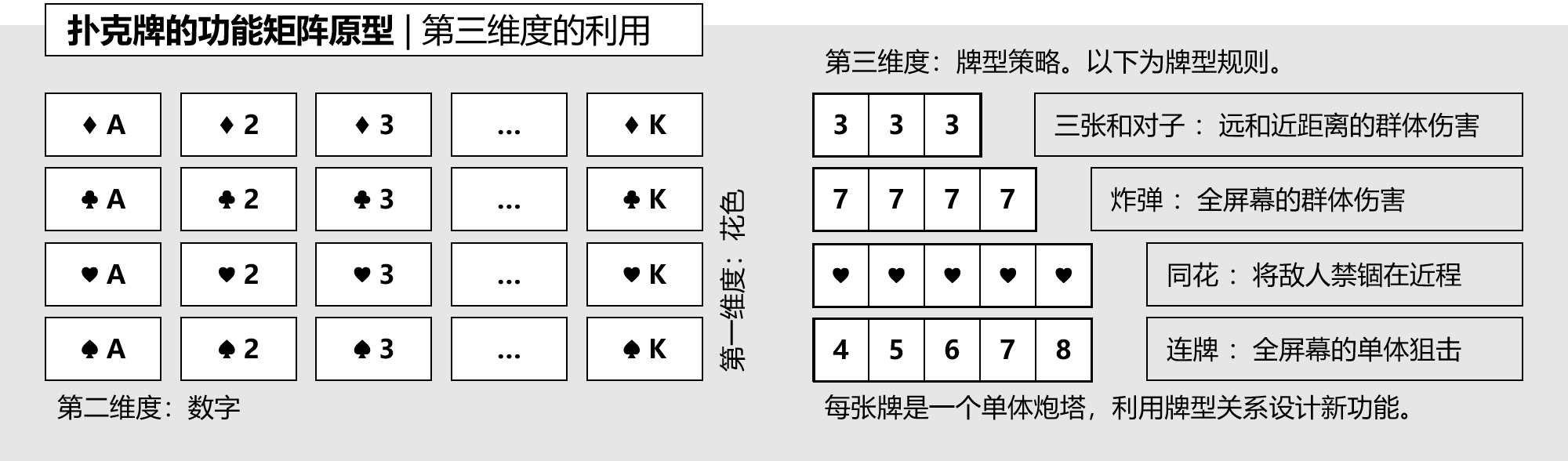 我们并不建议设计太复杂的综合体,因为当大脑难以判断时,就会开始大量试错,这不是我们想要的发展方法。我们建议通过增加维度的方法,让简单功能之间产生新的关系,从而形成综合体,类似麻将、扑克牌这些游戏。它们的每个工具都非常简单,容易比较和判断,第三维度也简单易用,但依然能提供丰富的决策挑战。如图7-3-4所示,这是扑克牌的功能矩阵原型图,注意第三维度牌型策略的利用。