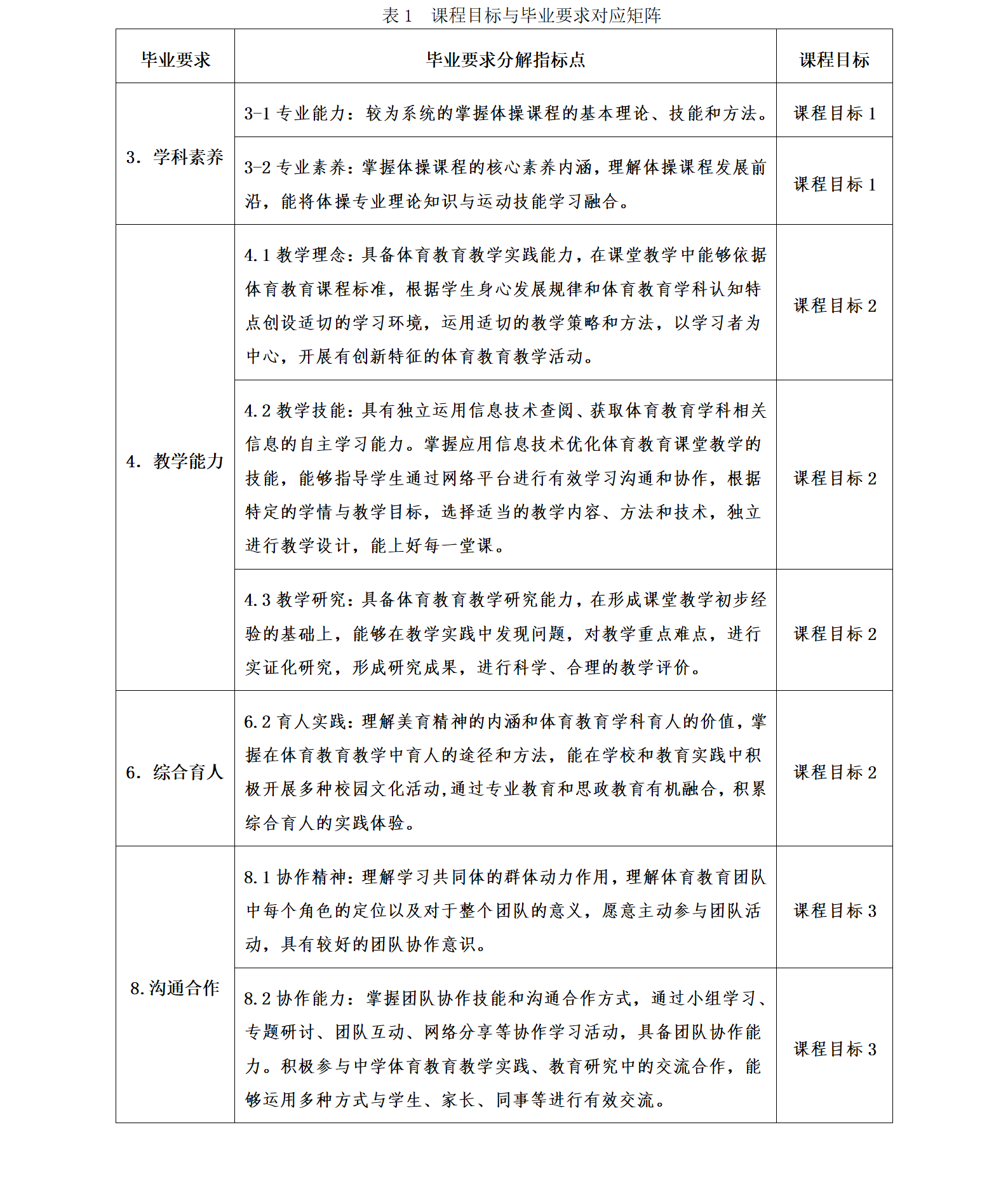 课程既适合体育教育、运动训练等体育相关专业的学生进行学习,也同样适合广大体操爱好者学习和了解体操运动。另外,我们在满足体育教育专业学生学习的同时,又从大体操概念的角度出发,使本课程理论和实践内容更加丰富和全面,并融入课程思政内容。既能满足高等体育院校体育教育专业人才培养的需求,又能满足大众健身的需求。同时,力争改变人们以往体操运动等同于竞技体操的传统思想观念和认识。