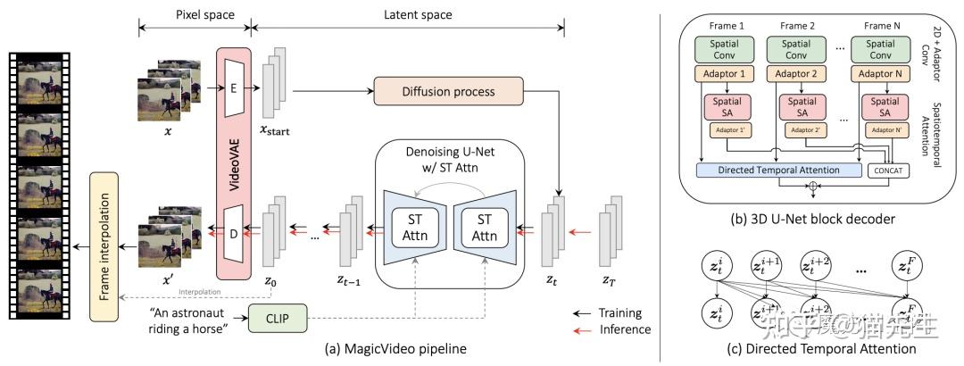 视频训练加速:使在图像任务上训练的U-Net降噪器适应视频数据:用于图像到视频分布调整的帧轻量级适配器和用于捕获跨帧时间依赖性的定向时间注意力模块,因此可以利用文本到图像模型中卷积运算符的信息权重来加速视频训练。
