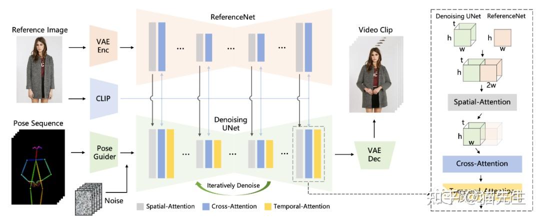 其次,通过CLIP图像编码器提取语义特征进行交叉注意力,时间注意力在时间维度上运作;