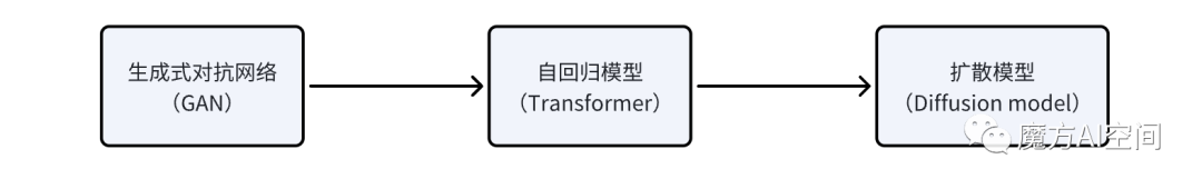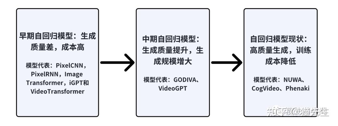 采用Transformer进行自回归图像生成。Transformer整体框架主要分为Encoder和Decoder两大部分,能够模拟像素和高级属性(纹理、语义和比例)之间的空间关系,利用多头自注意力机制进行编码和解码。关于Transformer的技术细节可以看这篇文章《开启AI大模型新时代|「Transformer论文精读」》。与GANs相比,自回归模型具有明确的密度建模和稳定的训练优势,自回归模型可以通过帧与帧之间的联系,生成更为连贯且自然视频。但是自回归模型受制于计算资源、训练所需的数据、时间,模型本身参数数量通常比扩散模型大,对于计算资源要求及数据集的要求往往高于其他模型。随着扩散模型的火热,自回归模型的热潮逐渐降低,AI绘画和视频生成的热潮渐起。自回归模型的技术演进过程: